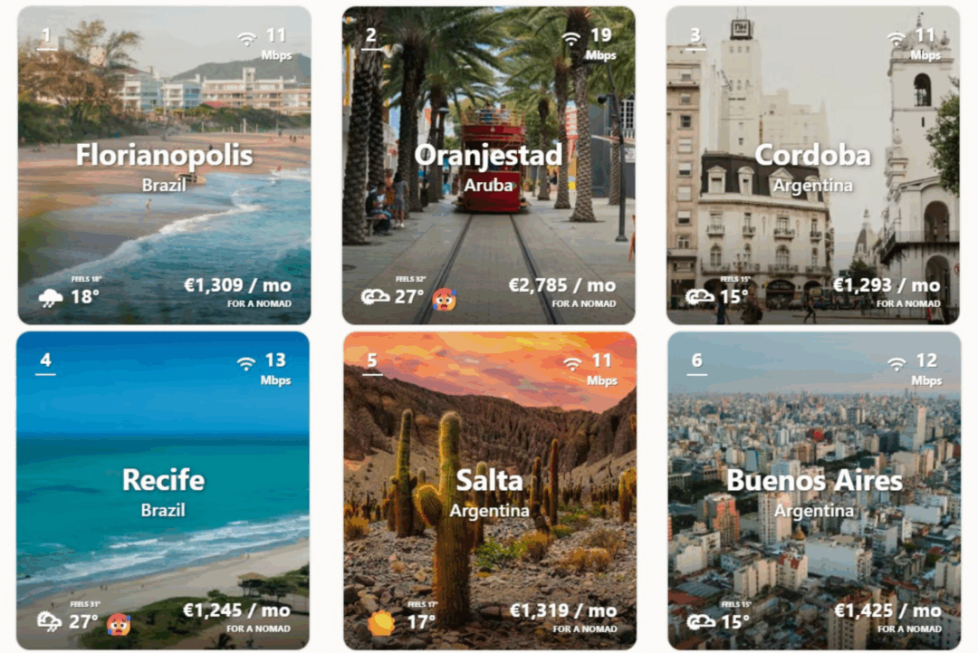 Según Nomad List, Córdoba se ubica ahora (junio 2025) detrás únicamente de Florianópolis (Brasil) y Oranjestad (Aruba), y por delante de capitales como Asunción (Paraguay) y Montevideo (Uruguay). Esta proyección internacional refuerza el atractivo de la ciudad tanto para profesionales independientes como para empleados corporativos que buscan un entorno seguro, dinámico y multicultural.